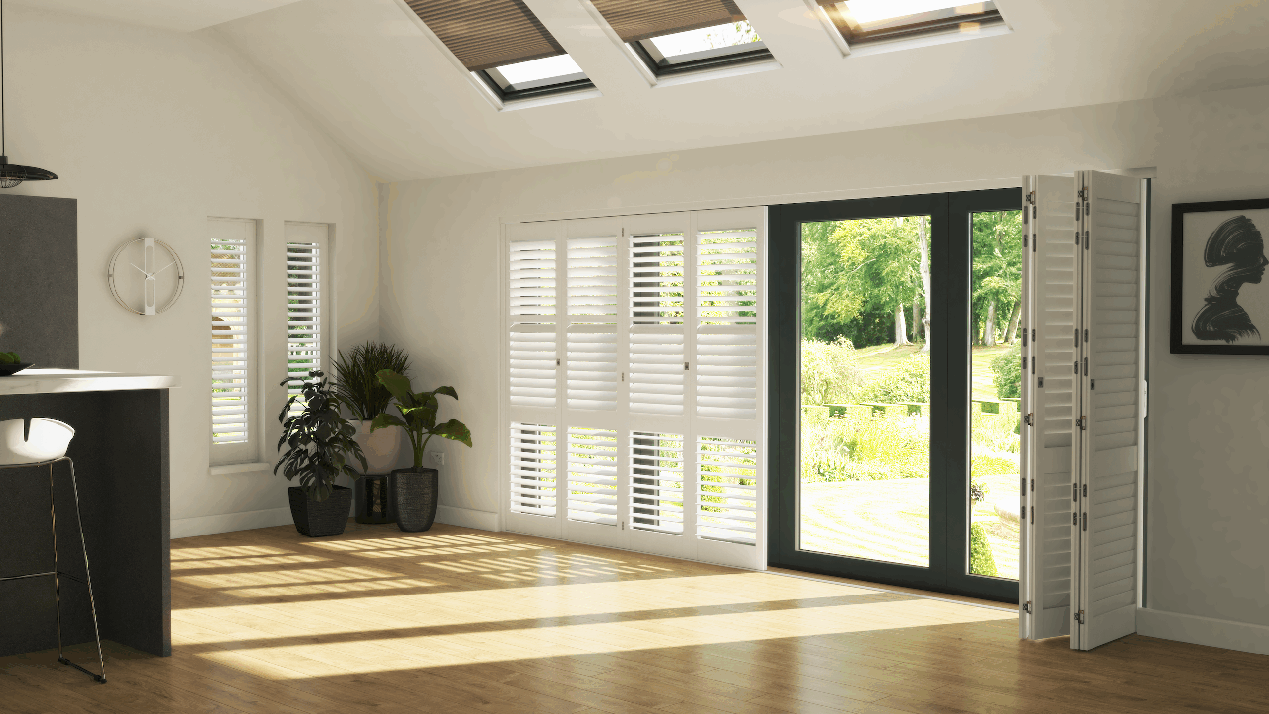 Functional and stylish kitchen shutters offer a low maintenance, easy clean solution for the busy kitchen environment. Let the light stream in during the day and keep it cosy at night.